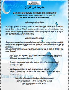 New Admission for Madhrasa Dhar-Ul-Quran - Maligawatta, Colombo - 10