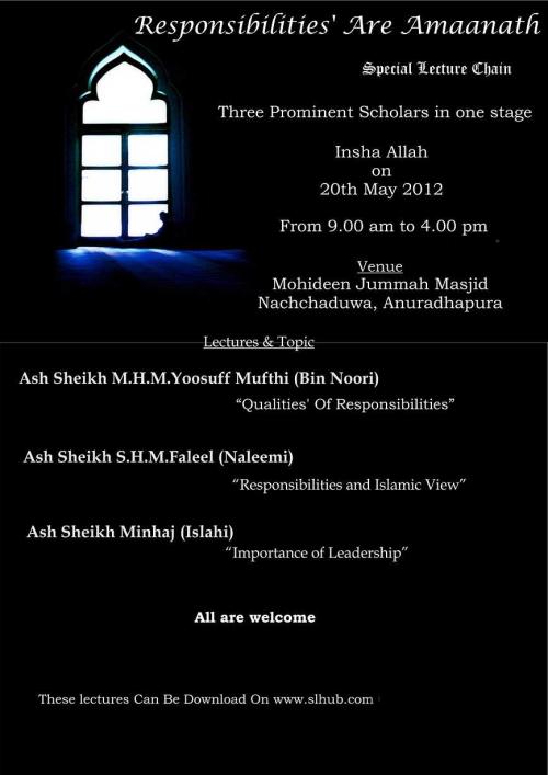Lectures & Topic - Ash Sheikh M.H.M.Yoosuff Mufti (Bin Noori)